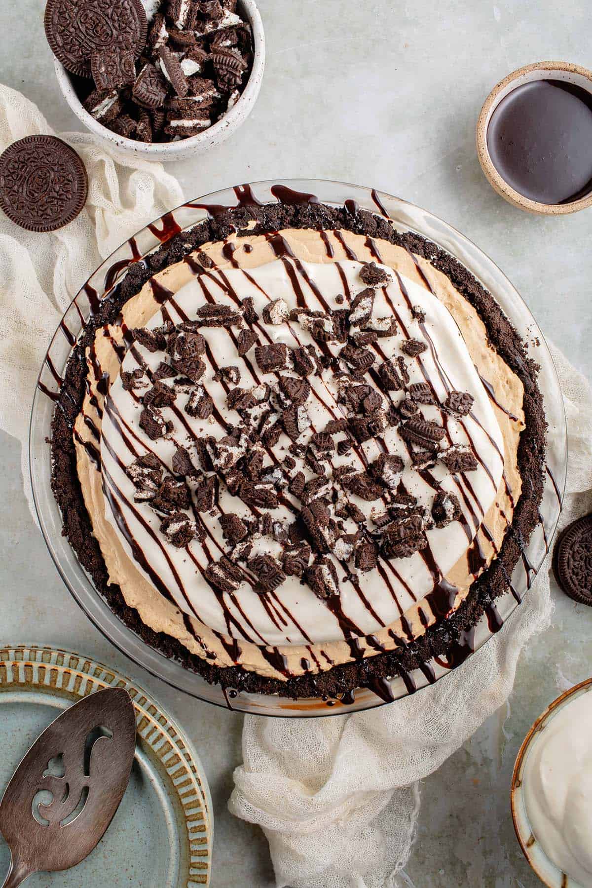 Our house-made Vegan Peanut Butter Pie – Rich, creamy peanut butter filling over a crunchy Oreo crust.